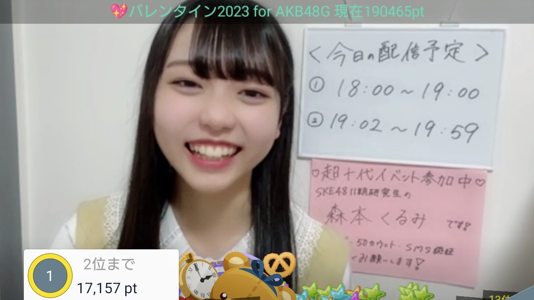 | 3🥉 | 森本 くるみ(SKE48 研究生) | 1386247 | -248283 |