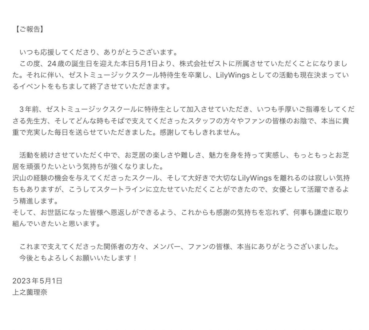 この度、24歳の誕生日を迎えた本日5月1日より、 株式会社ゼストに所属させていただくことになりまし た。それに伴い、 ゼストミュージックスクール特待生を卒業し、 Lily Wings としての活動も現在決まってい るイベントをもちまして終了させていただきます。