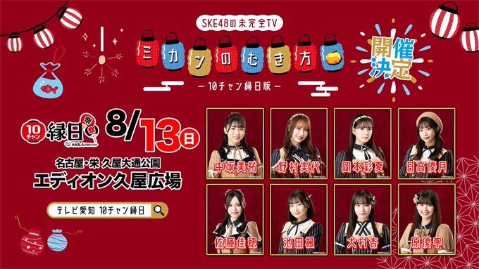 🔎 推しの出演日すぐ分かる! SKE48スケジュール検索ツール メンバー名・イベント名で簡単検索 ▶ 今すぐ検索する 8月12日(土)・13日(日) 10チャン縁日版 未完全TV ミカンのむき方開催!! @ 久屋大通公園 エディオン久屋広場 X はてブ Pinterest コピー コメント 2023.07.24 SKE48 36thシングル 「サンダルだぜ」購入はこちら(Yahoo!ショッピング) 出演メンバー中坂美祐 野村実代 岡本彩夏 日高優月 池田楓 佐藤佳穂 大村杏 原優寧 須田亜香里さん(8/12)、大久保佳代子さん(8/13)、呂布カルマさん(カラオケバトル:ゲスト)も縁日出演入場無料 ※飲食、アトラクションなど一部有料 10チャン縁日サイトhttps://tv-aichi.co.jp/10ch_ennichi2023/ ツイート読み込み中です エディオン 久屋広場 あんずたんとゆうねさん出演!! 【Amazon.co.jp限定】タイトル未定(SG+DVD)(Type-A)(初回生産限定盤)(特典付き:amazonオリジナル生写真) created by Rinker avex trax Amazon 楽天市場 BUBKA(ブブカ) 2024年10月号電子書籍限定版「SKE48 林美澪ver.」 [雑誌] created by Rinker Kindle Amazon 楽天市場 SKE48 井上瑠夏 1st写真集「タイトル未定」(仮) created by Rinker 扶桑社 Amazon 楽天市場 北野瑠華1st写真集(仮) created by Rinker 白夜書房 Amazon 楽天市場 関連記事: 鬼頭未来生誕祭実施 8月12日(月・祝)チームS「愛を君に、愛を僕に」公演 【動画!浴衣!】池田に似合う麦わら帽子は?10チャン縁日版「ミカンのむき方」エンディング公開【SKE48】 【池田楓参加決定!】11/12-13日 SKE48 #絶対インスピレーション」(劇場盤)現地でトーク会&グループトーク会 詳細!! 8月10日(水)~ 8月12日(金)「手をつなぎながら」「愛を君に、愛を僕に」初日公演上映会江籠裕奈「君が大好き、みたいなんです」劇場披露実施!! 8月12日(土)午後6時現在、「公演実施」を予定「SKE48 SUMMER Tour 2023」大阪公演 SKE48 鬼頭未来生誕祭/熊崎晴香生誕祭等 8月12日(木)~ 16日(月)劇場公演スケジュール