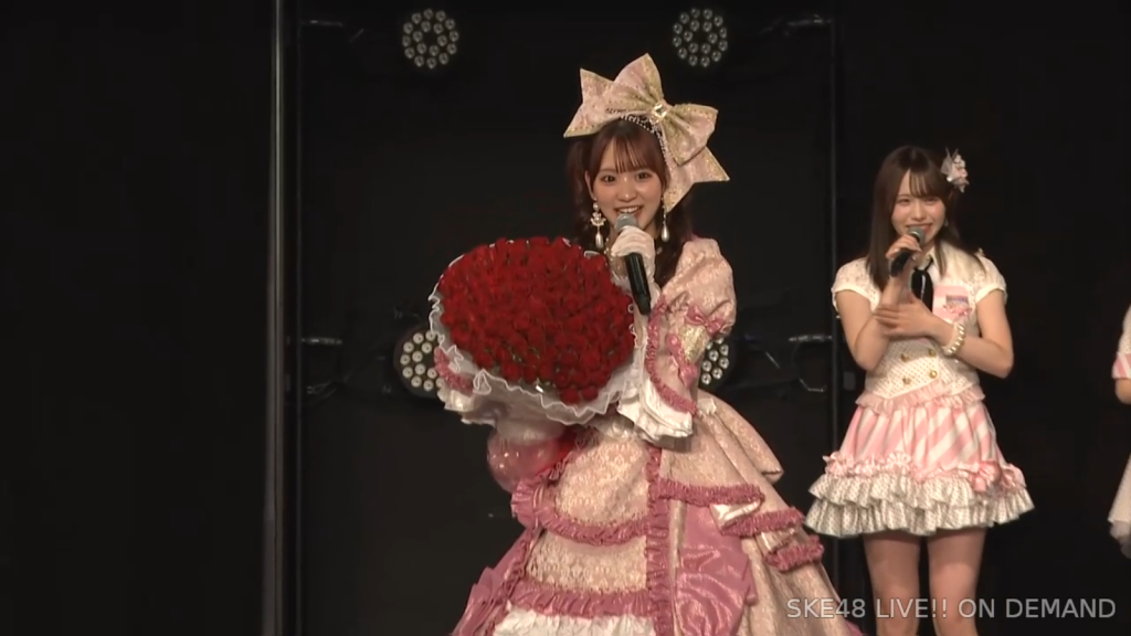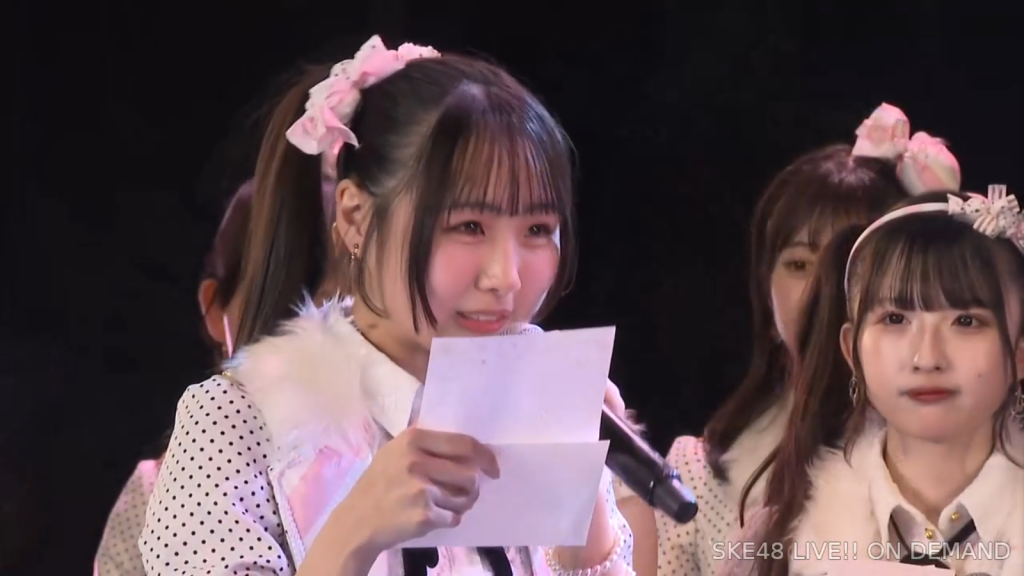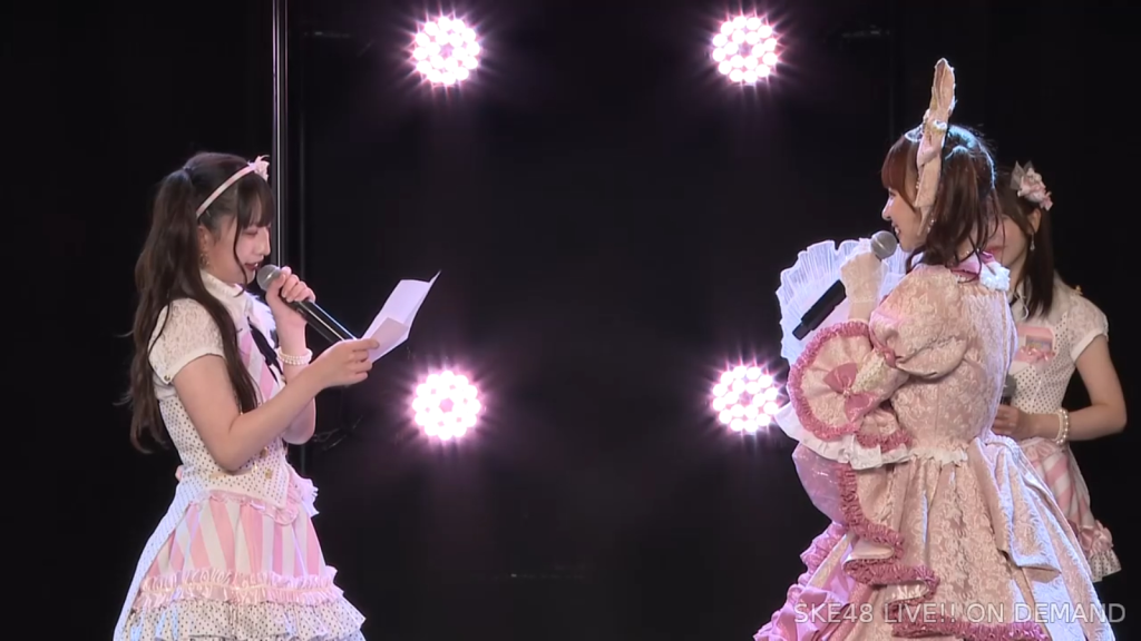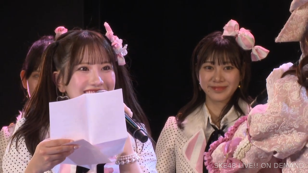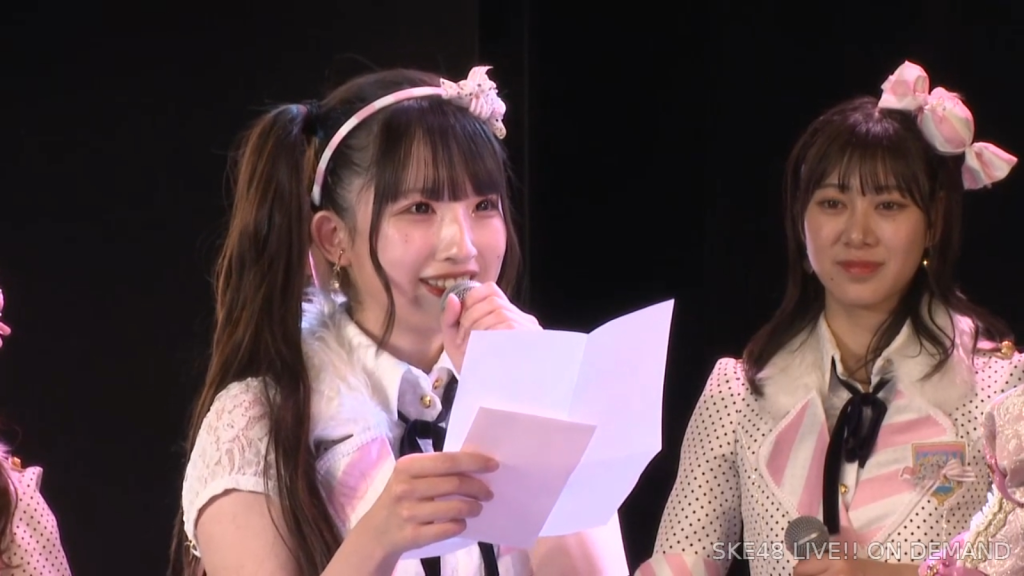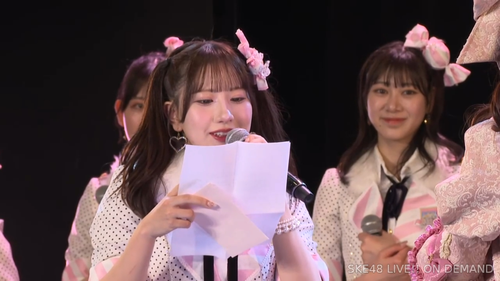 そしてまさかの阿弥さんからのお手紙ということで、阿弥さんが卒業されたタイミングがちょうど私が加入してもうすぐの頃ではあったので、お手紙を書いていただいたことがなかったので、こうして卒業のタイミングで、阿弥さんからお手紙をいただけてとっても嬉しいですし、卒業コンサートも一緒に「愛の意味を考えてみた」を歌うことができて、阿弥さんの卒業ぶりにステージで歌う夢も叶いまして、すごく幸せな時間を過ごさせていただきました。ずっと私が悩んでいたり、つらい時とかは、一緒に会ってくださって、たくさんお話を聞いていただきましたし、卒業コンサートも、本当だったら開催できなかったんですけれど、阿弥さんに「絶対諦めちゃだめだよ。やりたいことは絶対やりとうした方がいいから頑張って」って言われて、本当はできなかったかもしれないのに、阿弥さんの言葉で救われて、私も諦めないで、もう少し頑張ってみようって思うことができました。しれで素敵なコンサート開催することができましたし、素敵なドレスも作ってもらえて、私がSKE48で最後の目標としてずっと掲げてたのが、卒業コンサートをすることとドレスを作ってもらうことだったので、こんなに素敵な最後に最後を迎えられて、私は本当に良かったなって思いますし、あの時「諦めない方がいいよ」って言ってくださった阿弥さんには感謝の気持ちでいっぱいです。ずっと支えてくださった大先輩の阿弥さん、そして、いろいろなことを教わった先輩なので、これからも仲良くしていただけると嬉しいなと思っています。阿弥さん本当にありがとうございます。