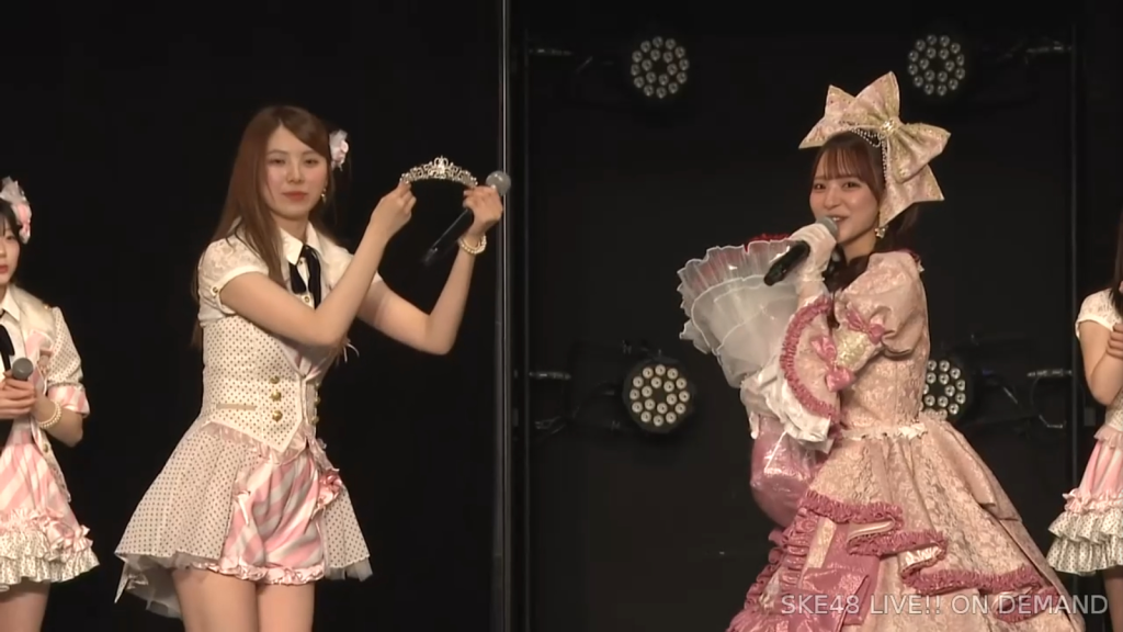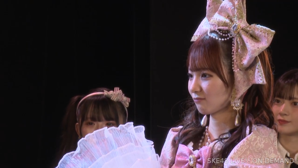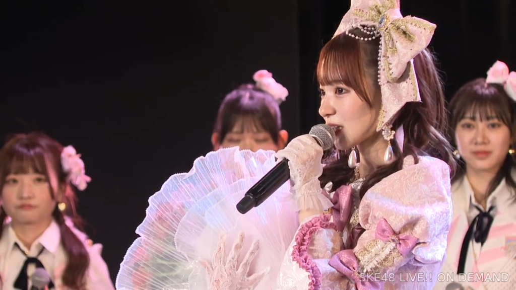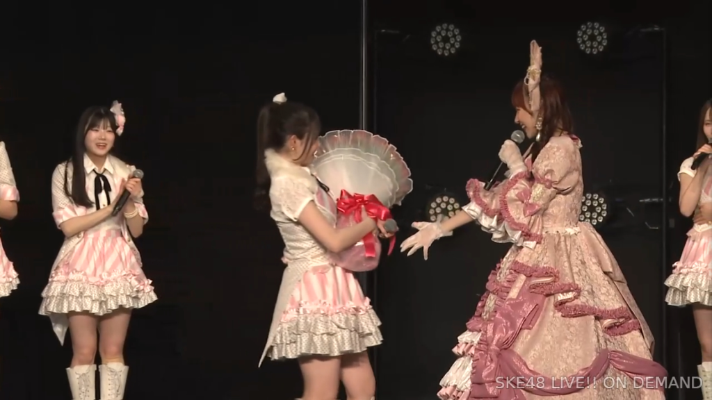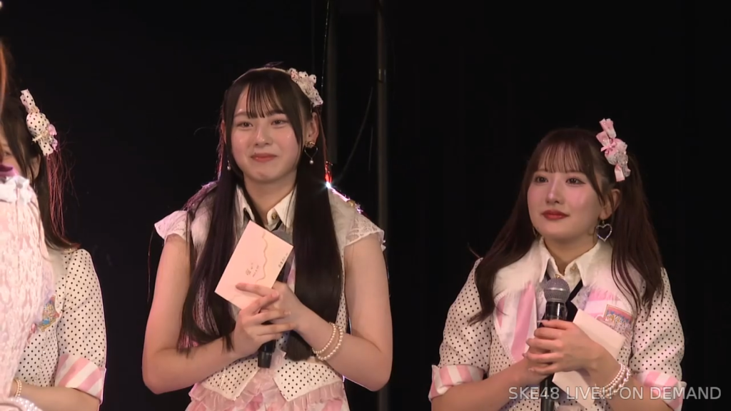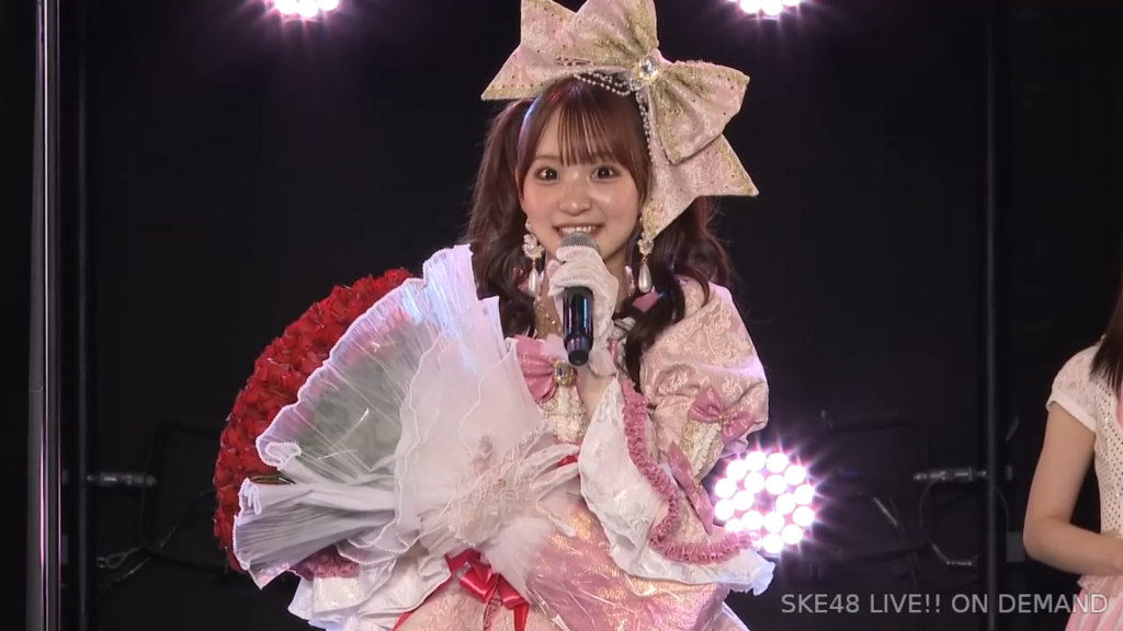 そしてまさかの阿弥さんからのお手紙ということで、阿弥さんが卒業されたタイミングがちょうど私が加入してもうすぐの頃ではあったので、お手紙を書いていただいたことがなかったので、こうして卒業のタイミングで、阿弥さんからお手紙をいただけてとっても嬉しいですし、卒業コンサートも一緒に「愛の意味を考えてみた」を歌うことができて、阿弥さんの卒業ぶりにステージで歌う夢も叶いまして、すごく幸せな時間を過ごさせていただきました。ずっと私が悩んでいたり、つらい時とかは、一緒に会ってくださって、たくさんお話を聞いていただきましたし、卒業コンサートも、本当だったら開催できなかったんですけれど、阿弥さんに「絶対諦めちゃだめだよ。やりたいことは絶対やりとうした方がいいから頑張って」って言われて、本当はできなかったかもしれないのに、阿弥さんの言葉で救われて、私も諦めないで、もう少し頑張ってみようって思うことができました。しれで素敵なコンサート開催することができましたし、素敵なドレスも作ってもらえて、私がSKE48で最後の目標としてずっと掲げてたのが、卒業コンサートをすることとドレスを作ってもらうことだったので、こんなに素敵な最後に最後を迎えられて、私は本当に良かったなって思いますし、あの時「諦めない方がいいよ」って言ってくださった阿弥さんには感謝の気持ちでいっぱいです。ずっと支えてくださった大先輩の阿弥さん、そして、いろいろなことを教わった先輩なので、これからも仲良くしていただけると嬉しいなと思っています。阿弥さん本当にありがとうございます。