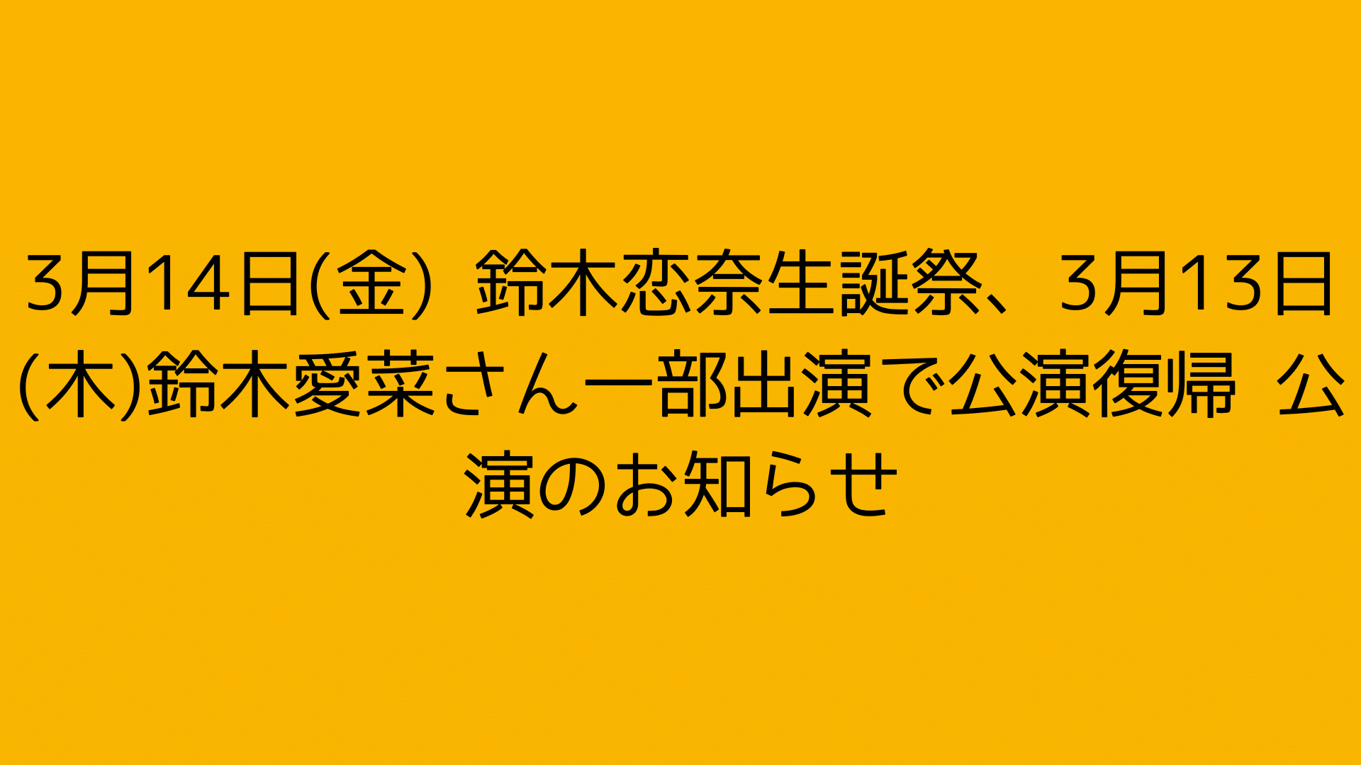 3月10日(月)制服の芽公演・3月11日(火)「手をつなぎながら」公演・3月13日(木)チームKⅡ「時間がない」公演・3月14日(金)チームE「声出していこーぜ!!!」公演 鈴木恋奈生誕祭実施・募集のお知らせ3月10日~3月14日公演募集のお知らせとなります。応募の詳細について下記ご確認ください。また、今後の状況によっては中止となる可能性もございますのでご了承ください。■3月10日(月)「制服の芽」公演<18:00開演>メンバー:赤堀君江・岡本...