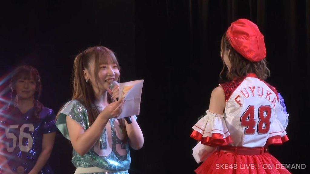 そして、背番号が後ろ48なんですけど、これも背番号何番がいいって聞かれて、4月3日なので43にしようかなとか思ったりしたんですけど、やっぱりずっとなりたかった48グループなので、48を背負ってやめたいなと思ったので48にさせていただいたのと、もし次のステップで始球式ができるってなった時に、「48じゃないのに48つけやがって」とかちょっと思われずに。始球式もいろんな条件とかがあると思うので、この衣装でできないかもしれないんですけど、いろんな条件が合致してこの衣装を着てできますよってなった時には、「ふゆの長年の夢がバトンと共に叶ったんだな」という風に見守ってくださったらすごい嬉しいので、私はこの衣装と共に次のステップに進みます。