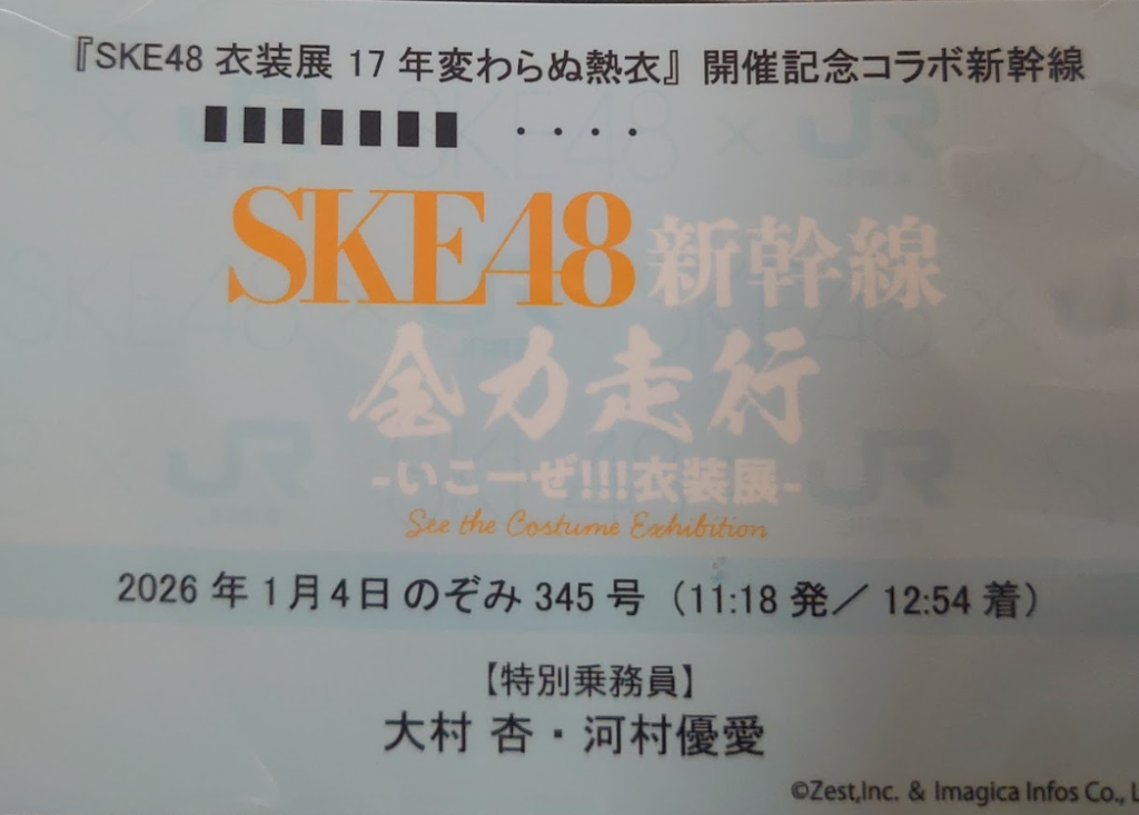 2026年1月4日(日)に実施された『SKE48新幹線 全力走行 ・いこーぜ!!!衣装展・』に参加いたしました。東京から名古屋まで乗車し、車内ではSKE48 チームEの大村杏さん、河村優愛さんが、新幹線の通路をランウェイに見立てたファッションショーを行う企画がありました。