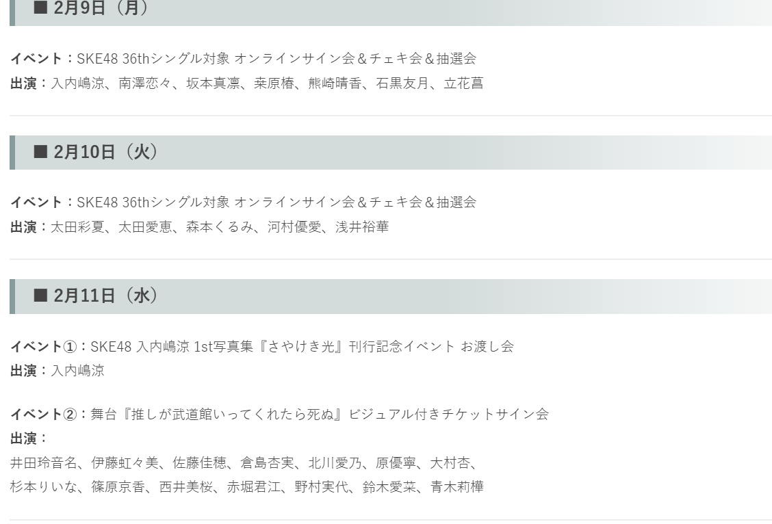 SKE48 今週のスケジュール 2026年2月9日~2026年2月15日