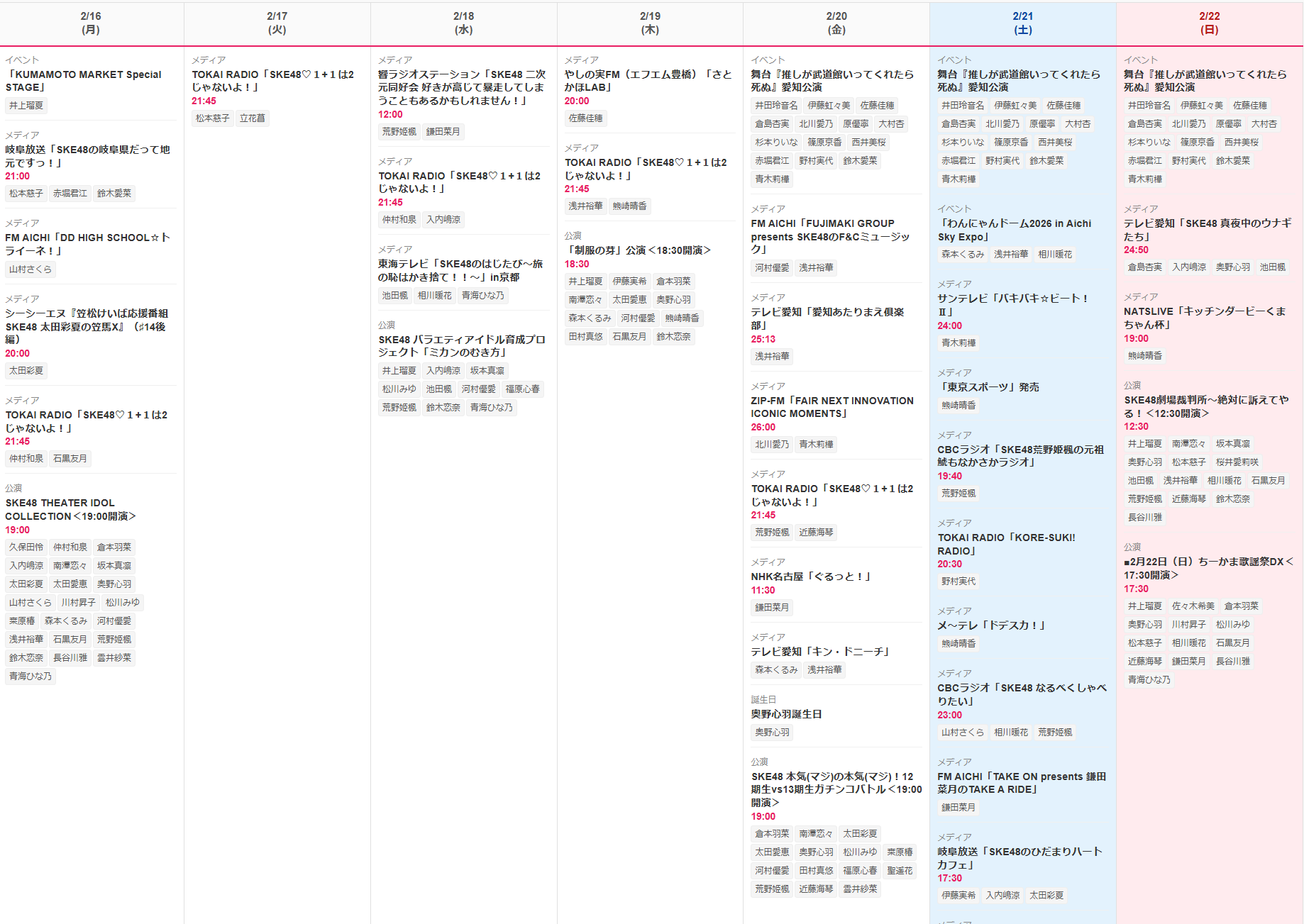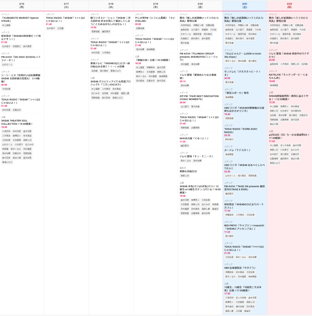 SKE48の今週のスケジュール(2026年2月16日~2月22日)をまとめました。