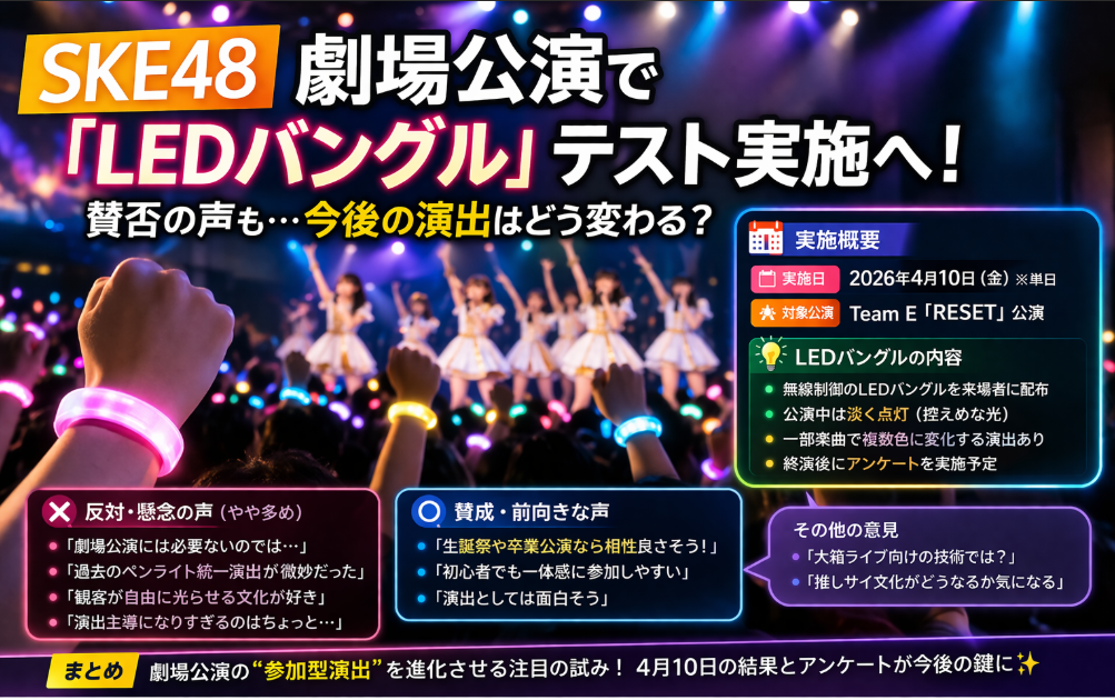 劇場公演での新たな取り組みとしてLEDバングルのテストマーケティング実施が発表されました。